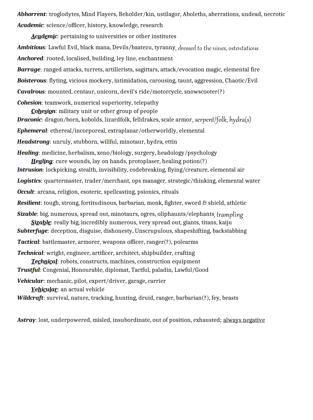> added list of Trait definitions/delineations with examples of 'combinations'; needs to have reminder that Astray is always temporary (tiny red cardboard marker?) in sidebar, once proper layout becomes a thing